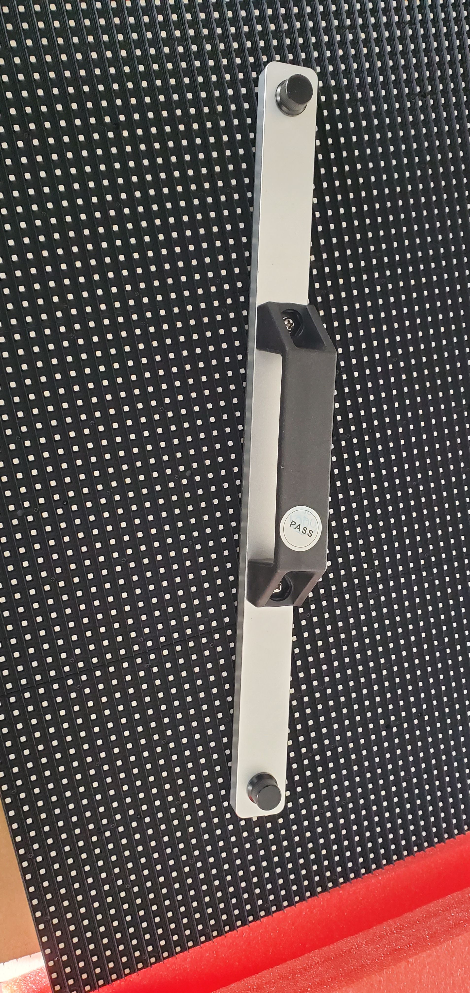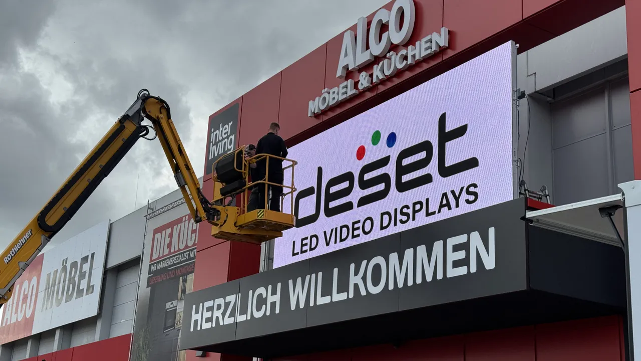 LED Display in Dachmontage auf einem Schienen-System. Die Schienenmontage erlaubt eine präzise Ausrichtung und einfache Wartung. Das Display ist auf einem speziellen Trägersystem auf dem Dach befestigt, das eine optimale Sichtbarkeit und sichere Befestigung garantiert.