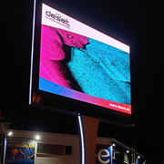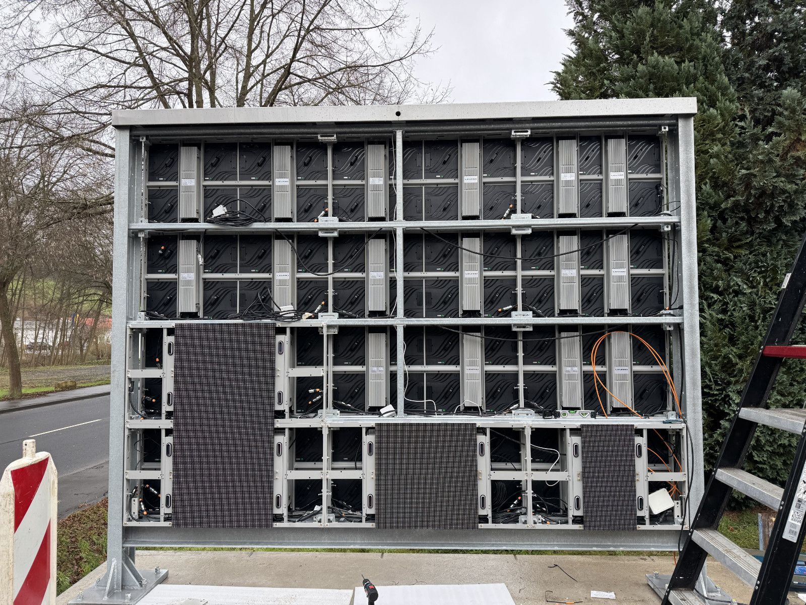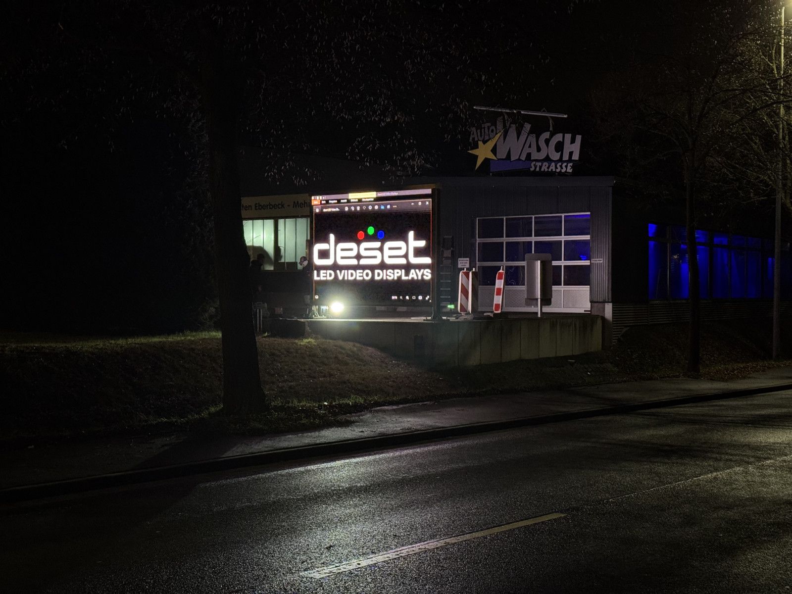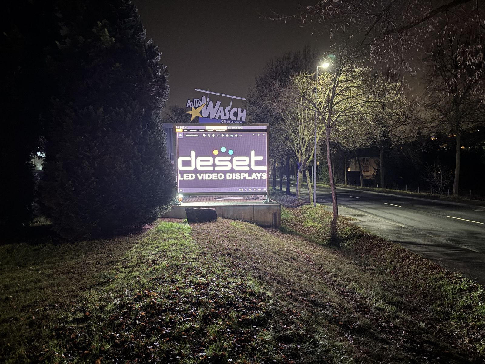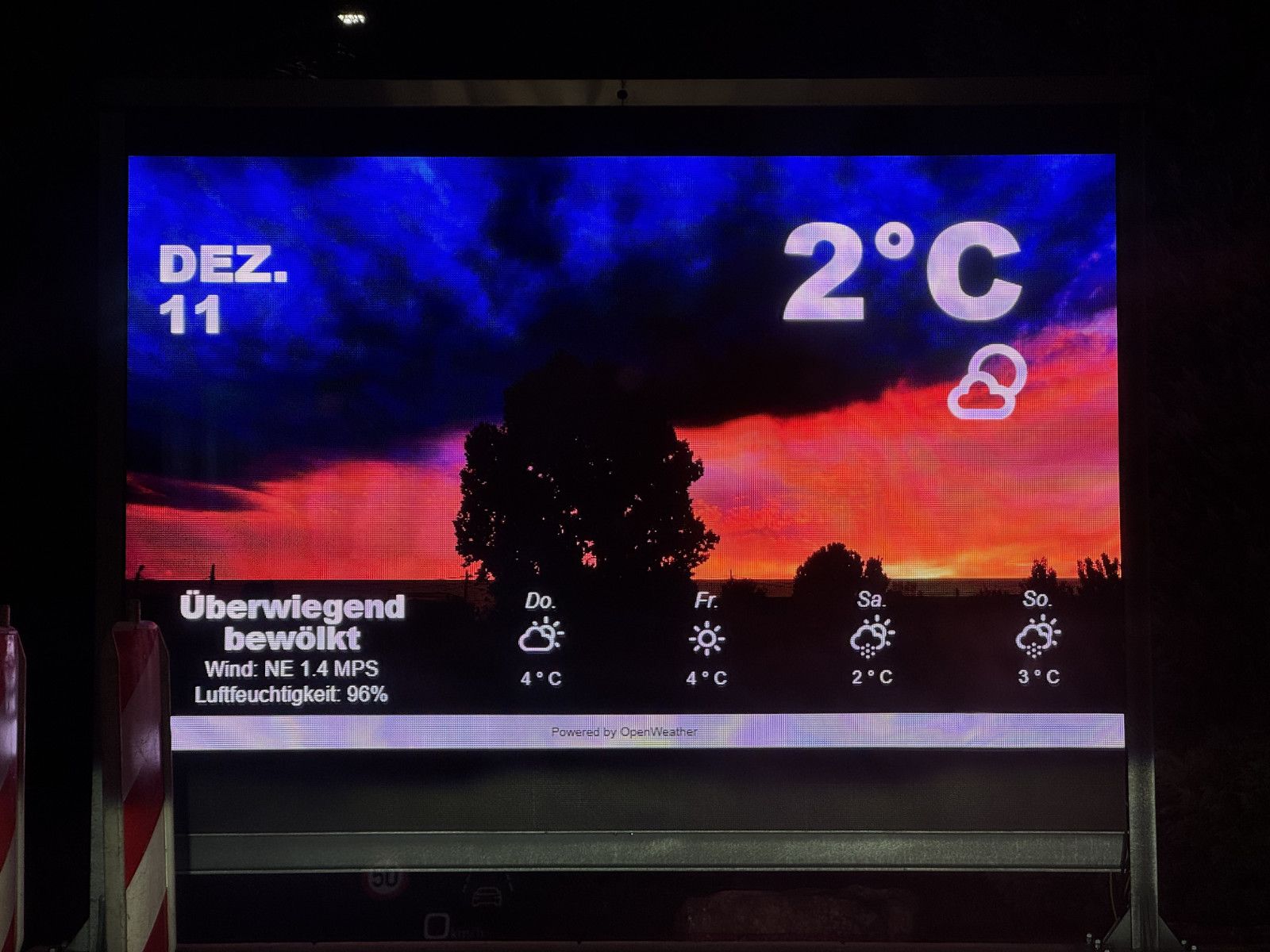 Doppelseitiges Display mit Doppel-Standfuß für einen KFZ-Betrieb. Integriertes Content-Management mit Wetter-Widget. Automatische Werbezeitplanung über Screenpool.