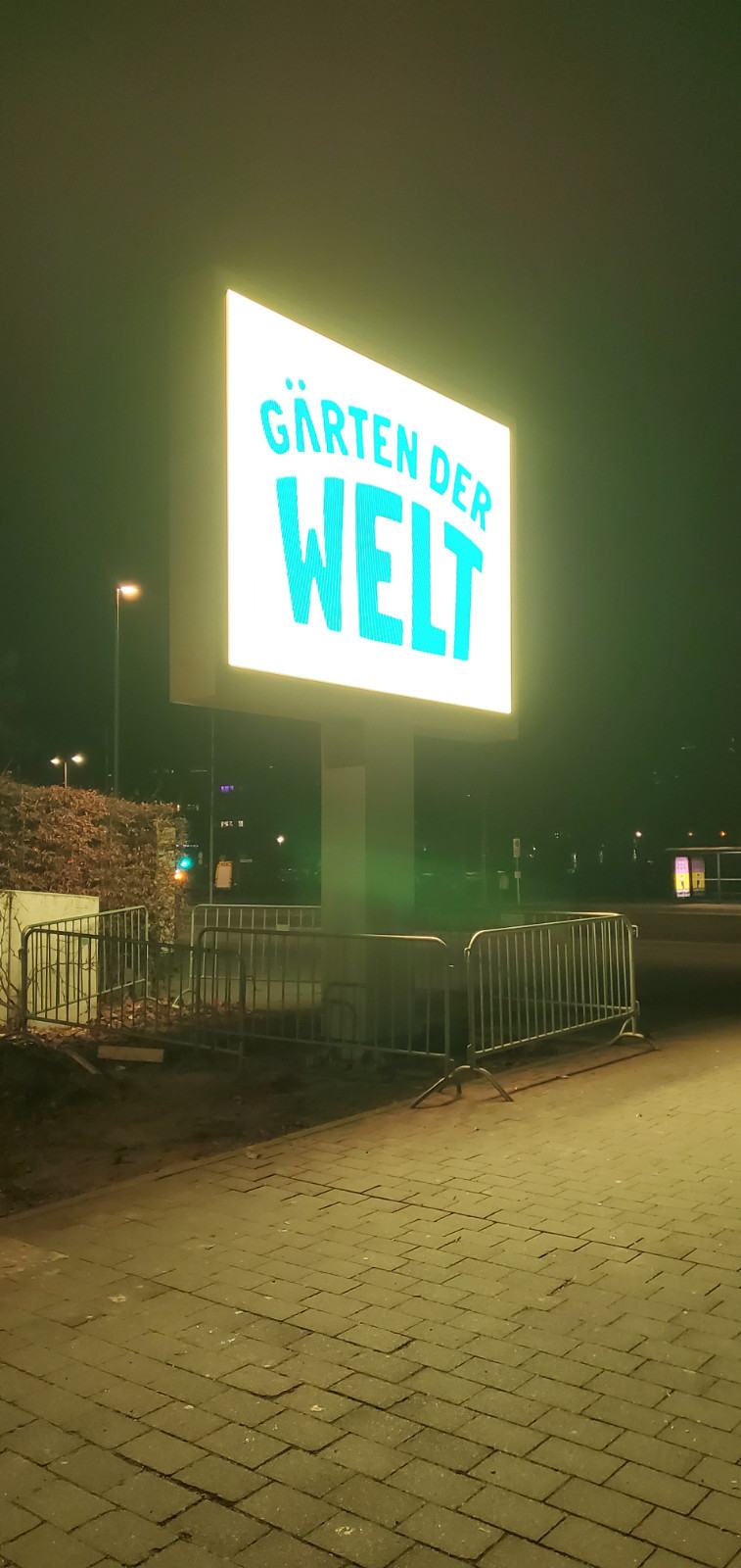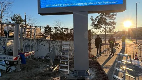 Doppelseitiger Freisteher mit Einzel-Standfuß für Besucherinformation. Das Display auf Stahlkonstruktion ist beidseitig bestückt und bietet maximale Sichtbarkeit für Passanten aus beiden Richtungen.