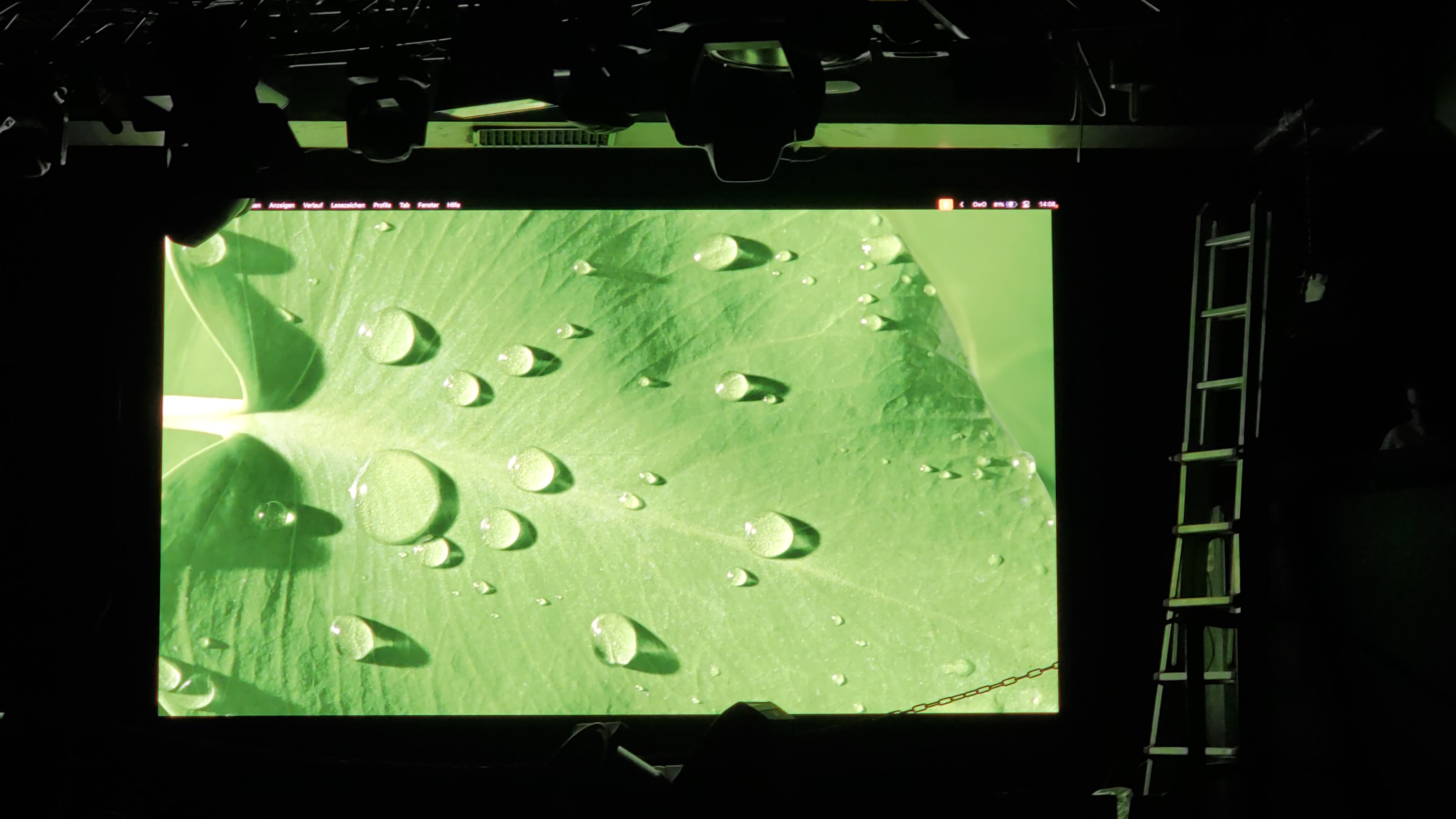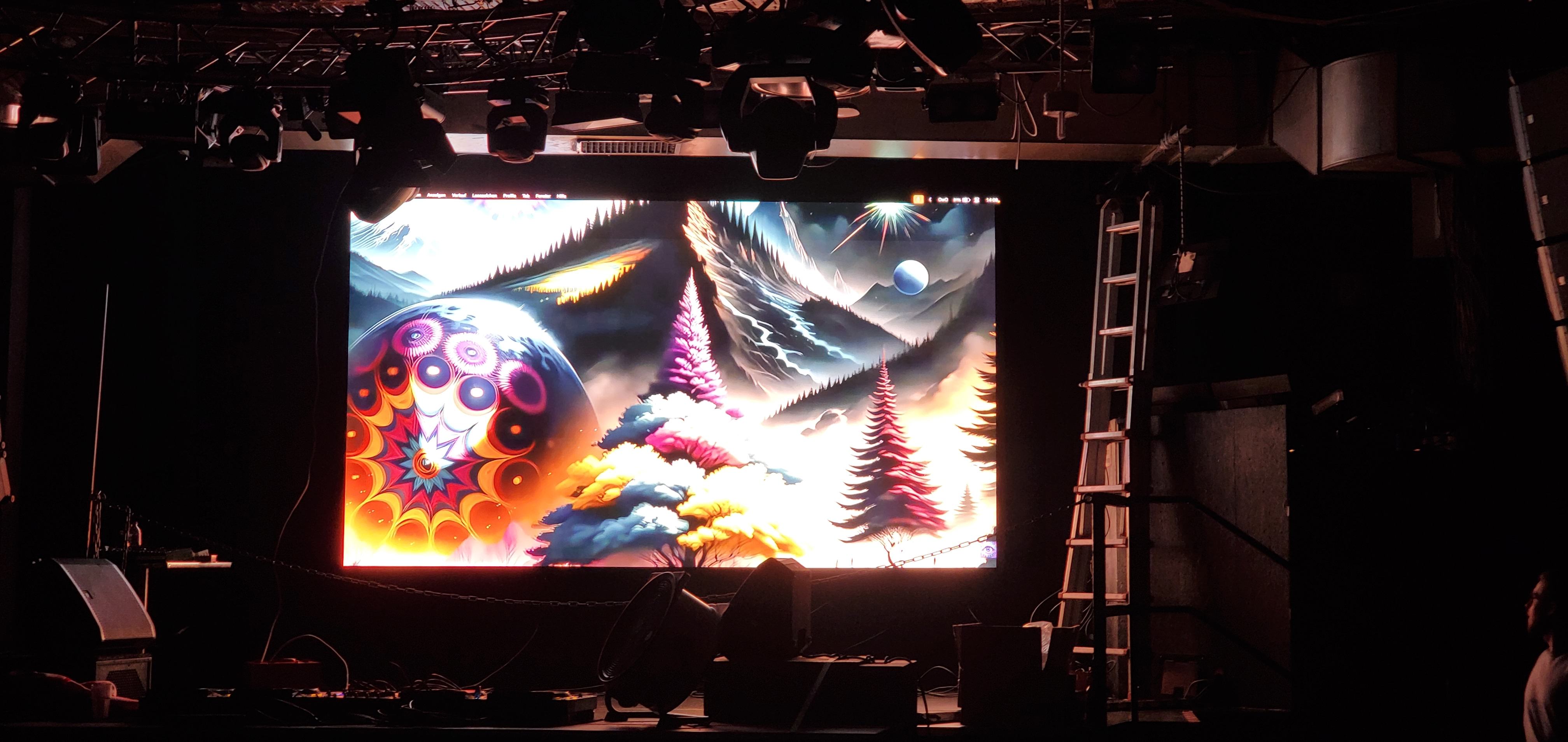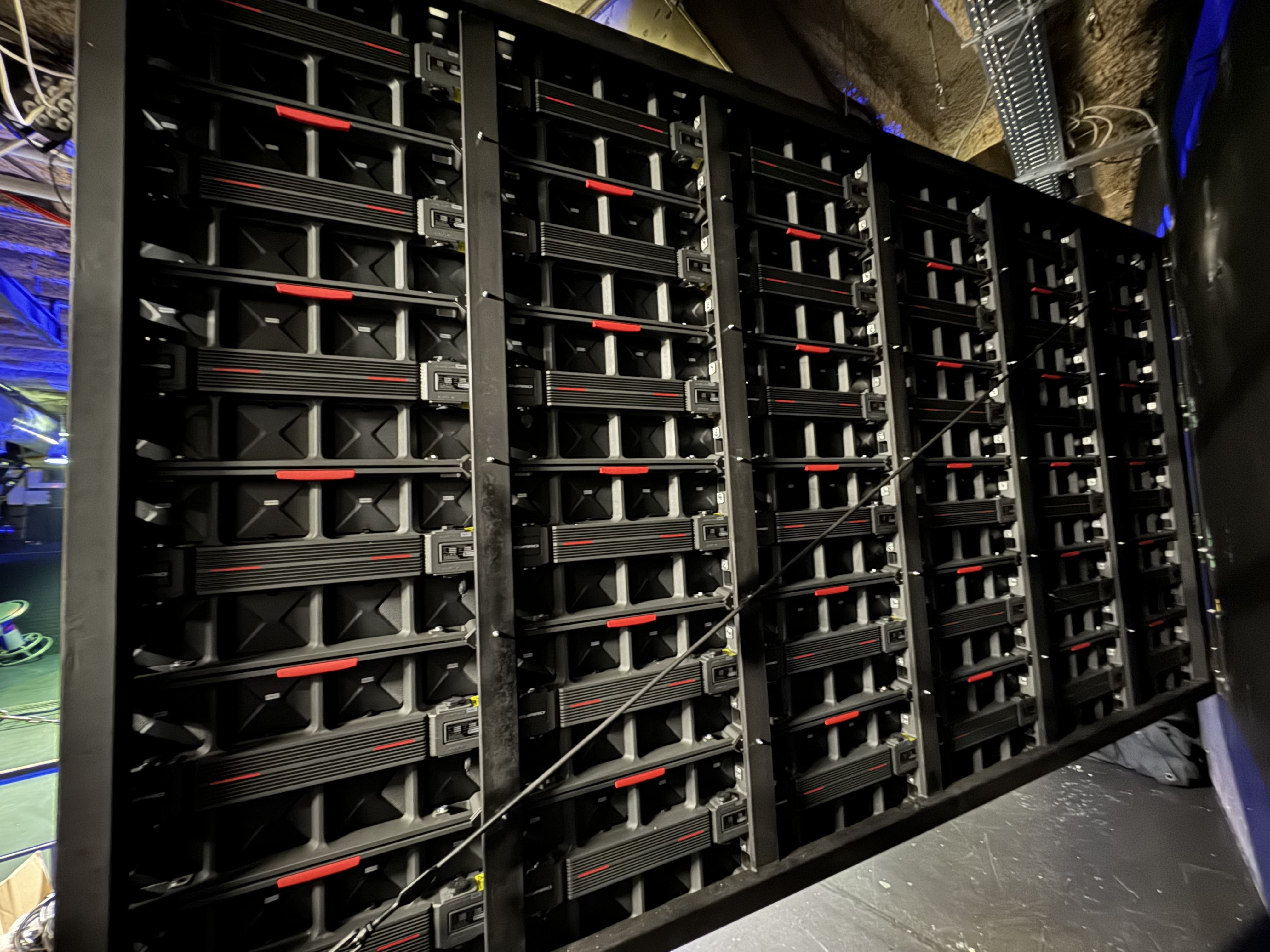 Ultra-hochauflösendes Indoor LED Display mit klappbarer Wandmontage in einem Stuttgarter Club. Das 8,29 m² große Display mit P1.8mm Pixelabstand liefert gestochen scharfe Bilder — ideal für die Bespielung mit Visuals und Eventgrafiken.
