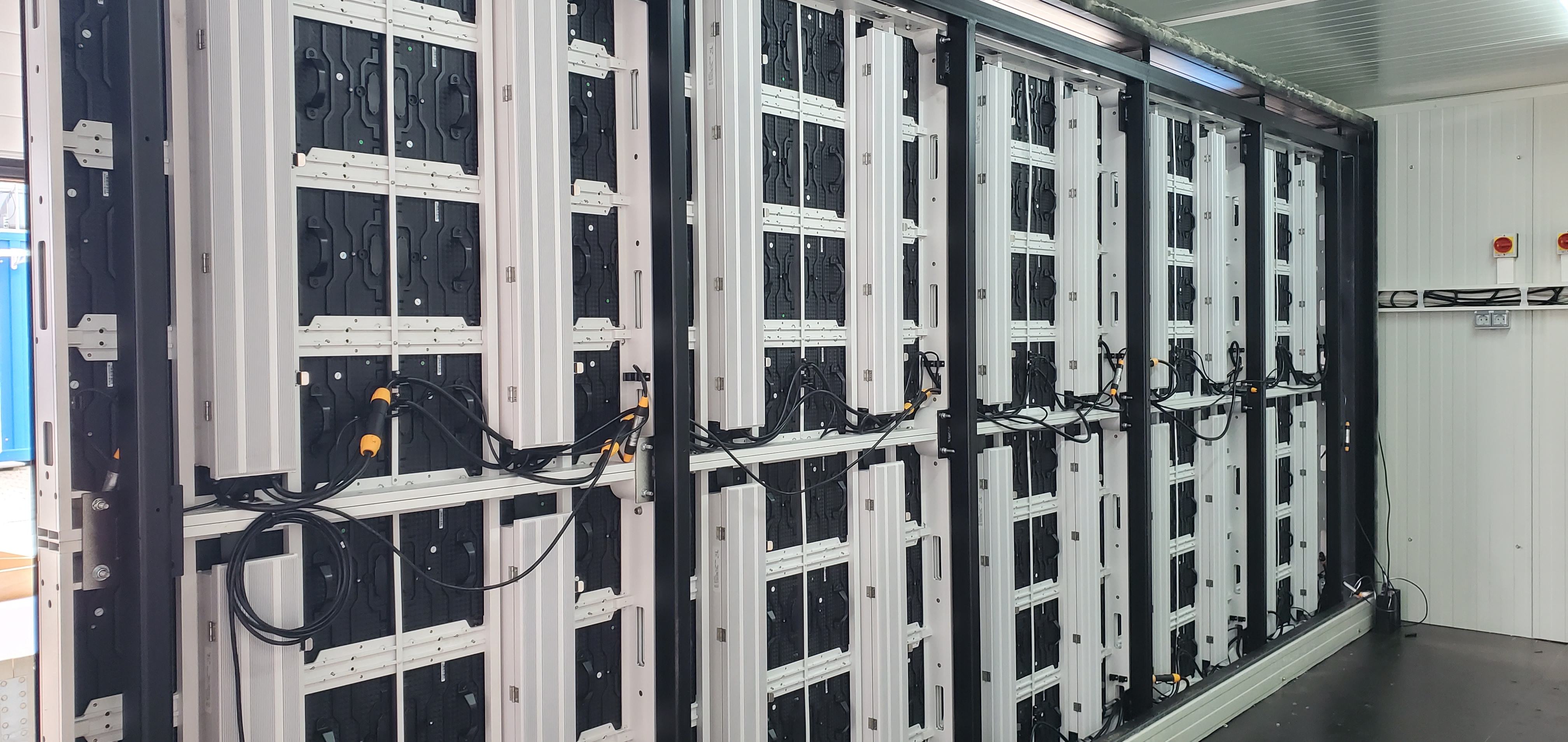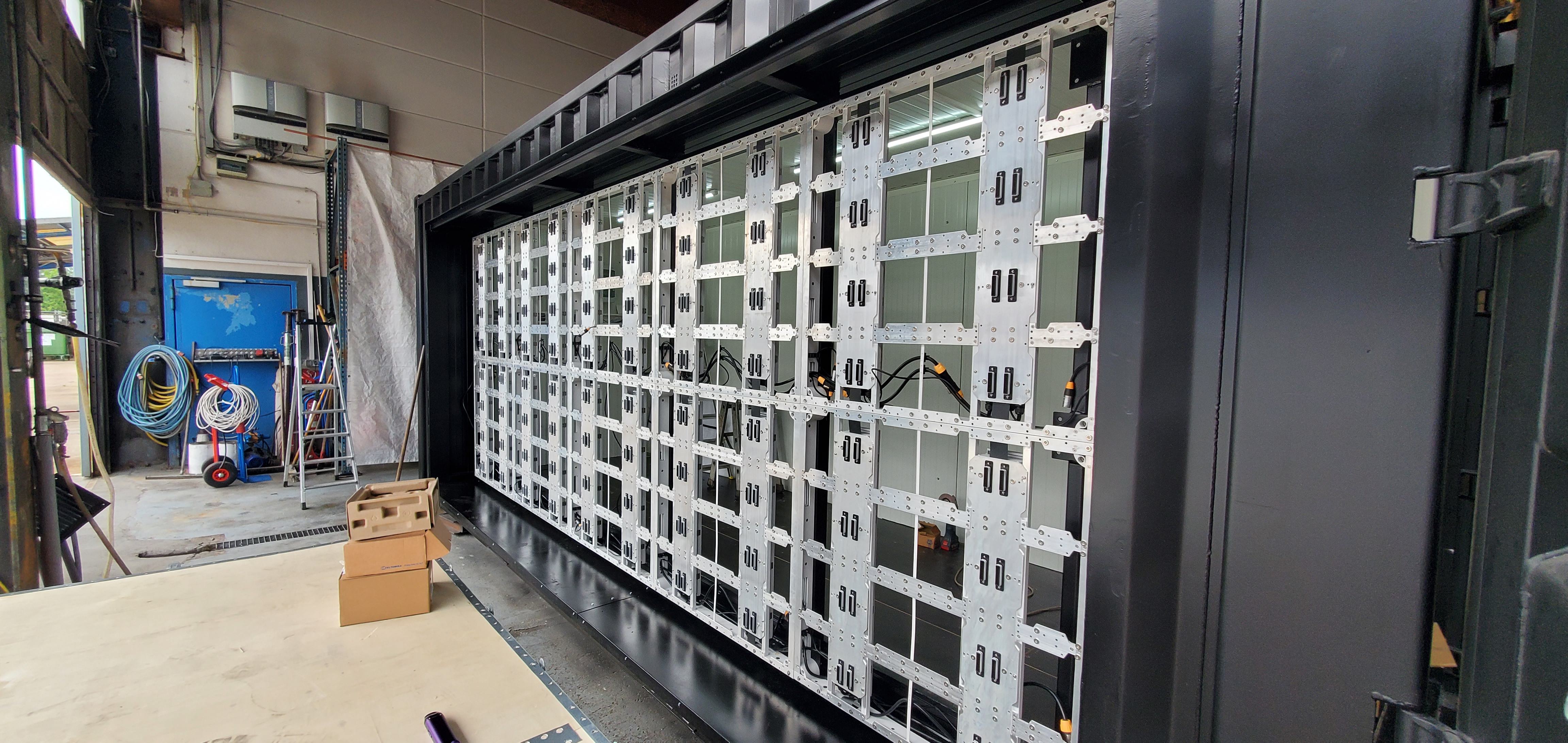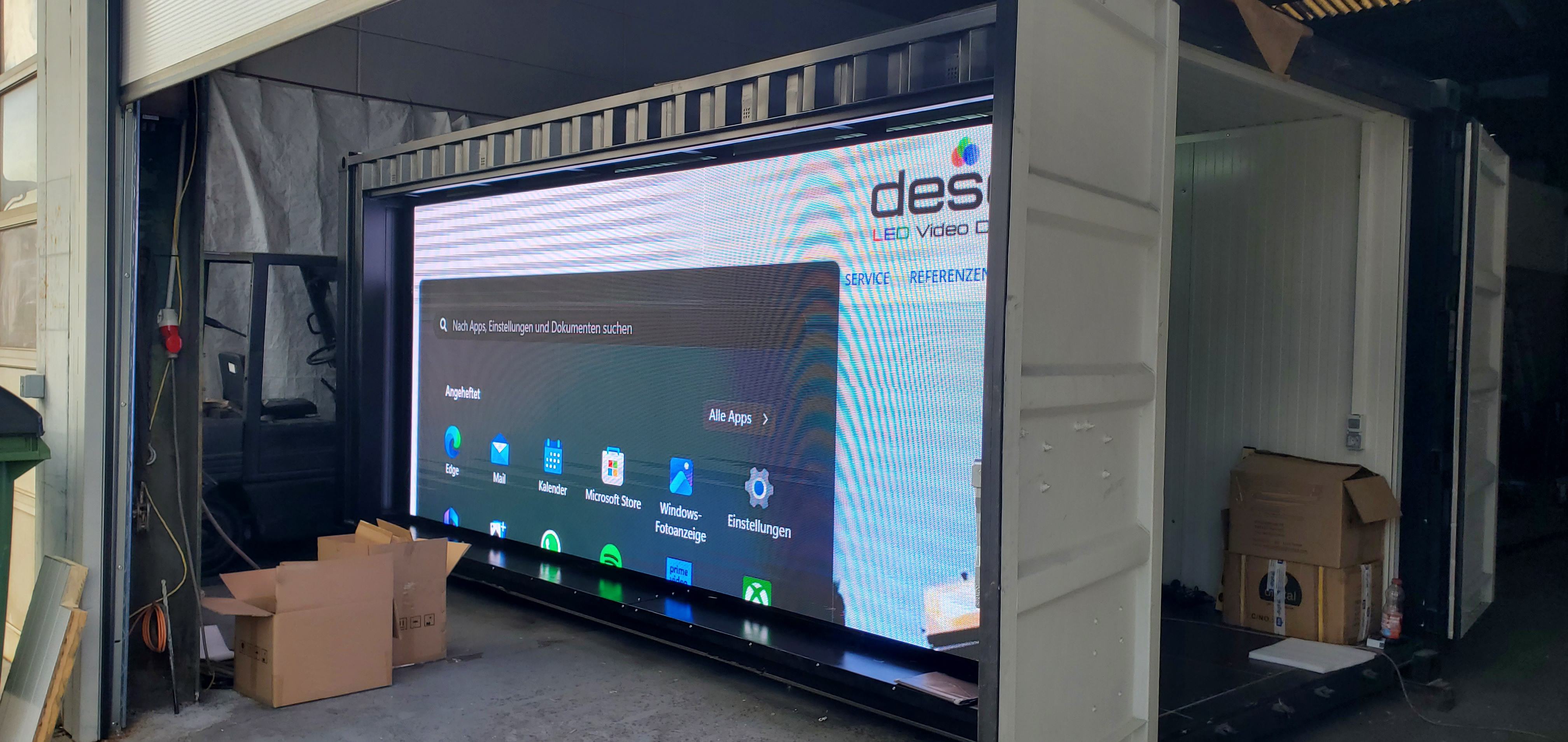 LED Display montiert an einem 20-Fuß-Seecontainer — die mobile Komplettlösung. 5m × 2m (10 m²) Displayfläche mit P4.8 Outdoor-Modulen und 6.500 Nit Helligkeit. Novastar KU20 Videoscaler mit HDMI-Anschluss. Ideal für Public Viewing, temporäre Werbung und mobile Events.