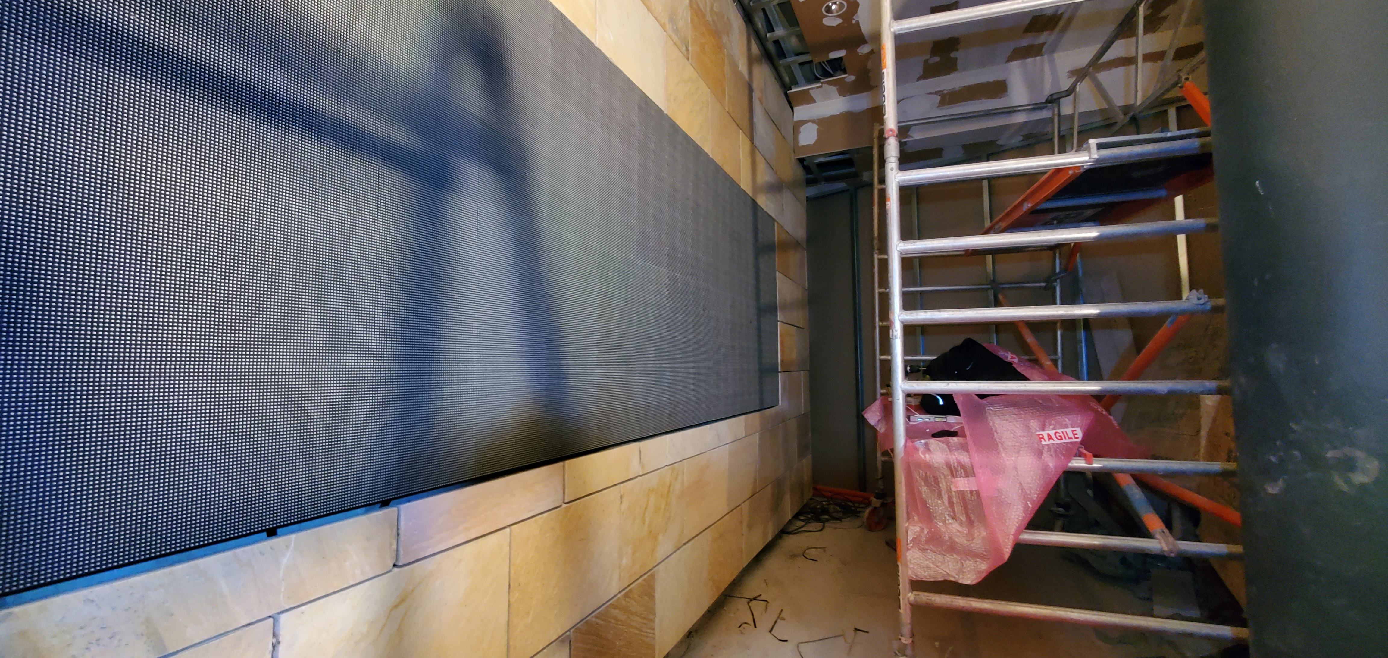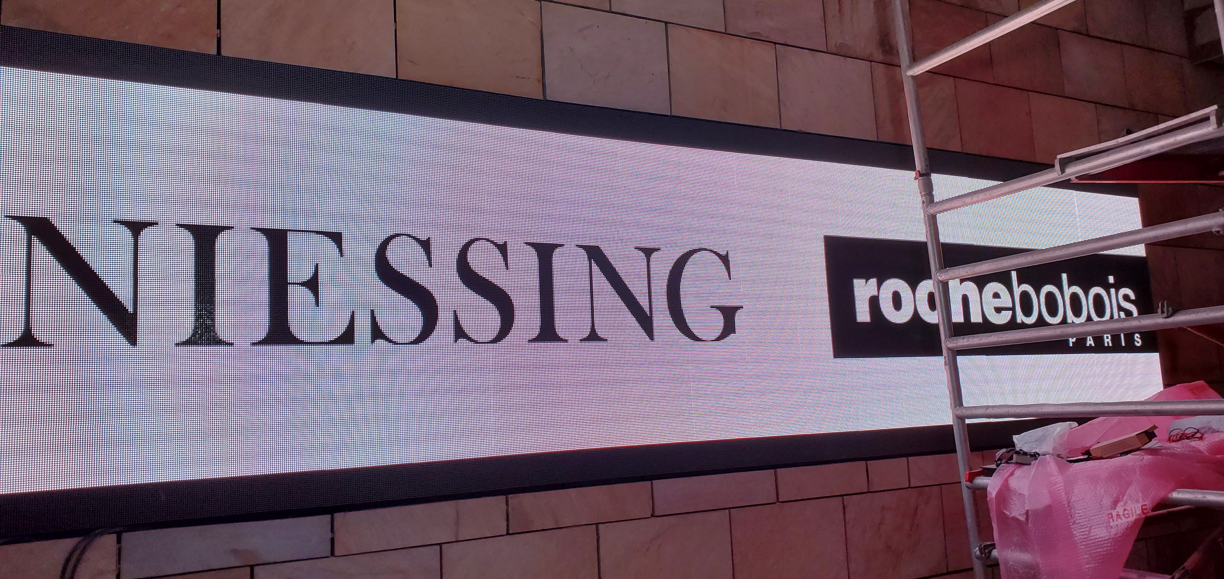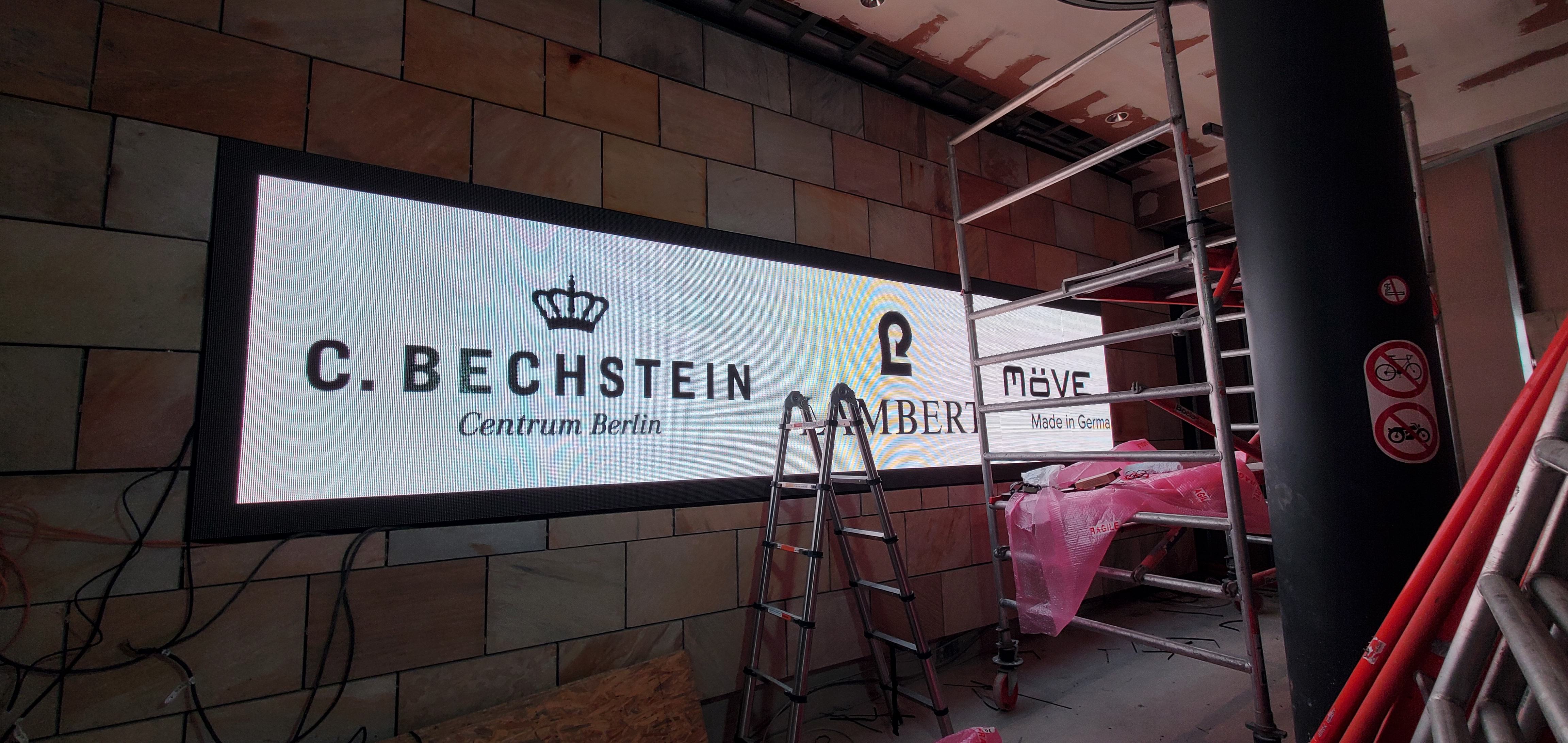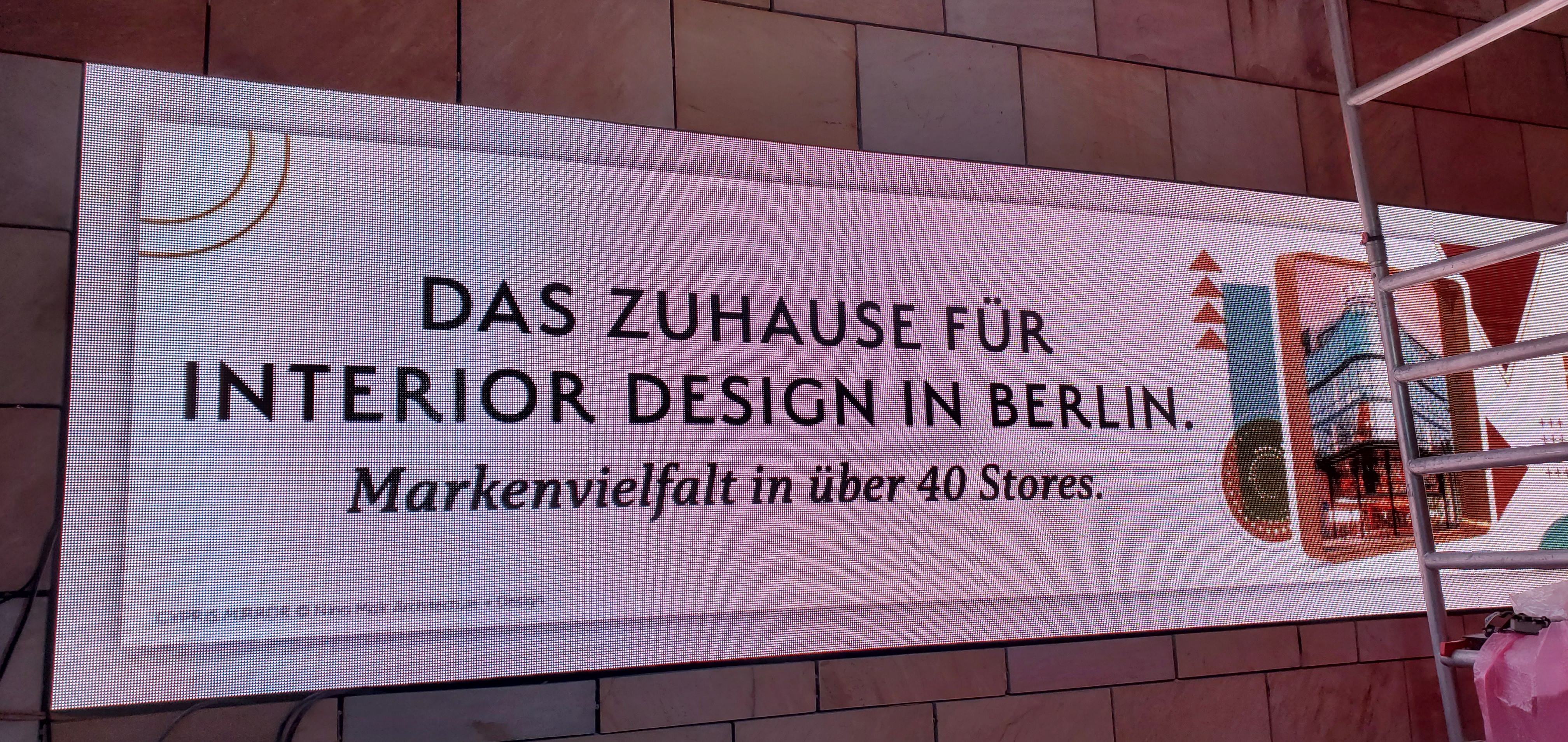 Hochwertiges Indoor LED Display im Eingangsbereich eines Premium-Möbelhauses in Berlin. Das Display dient der Kundenbegrüßung und zeigt emotionale Wohnlandschaften und Produktinspirationen in brillanter Qualität.