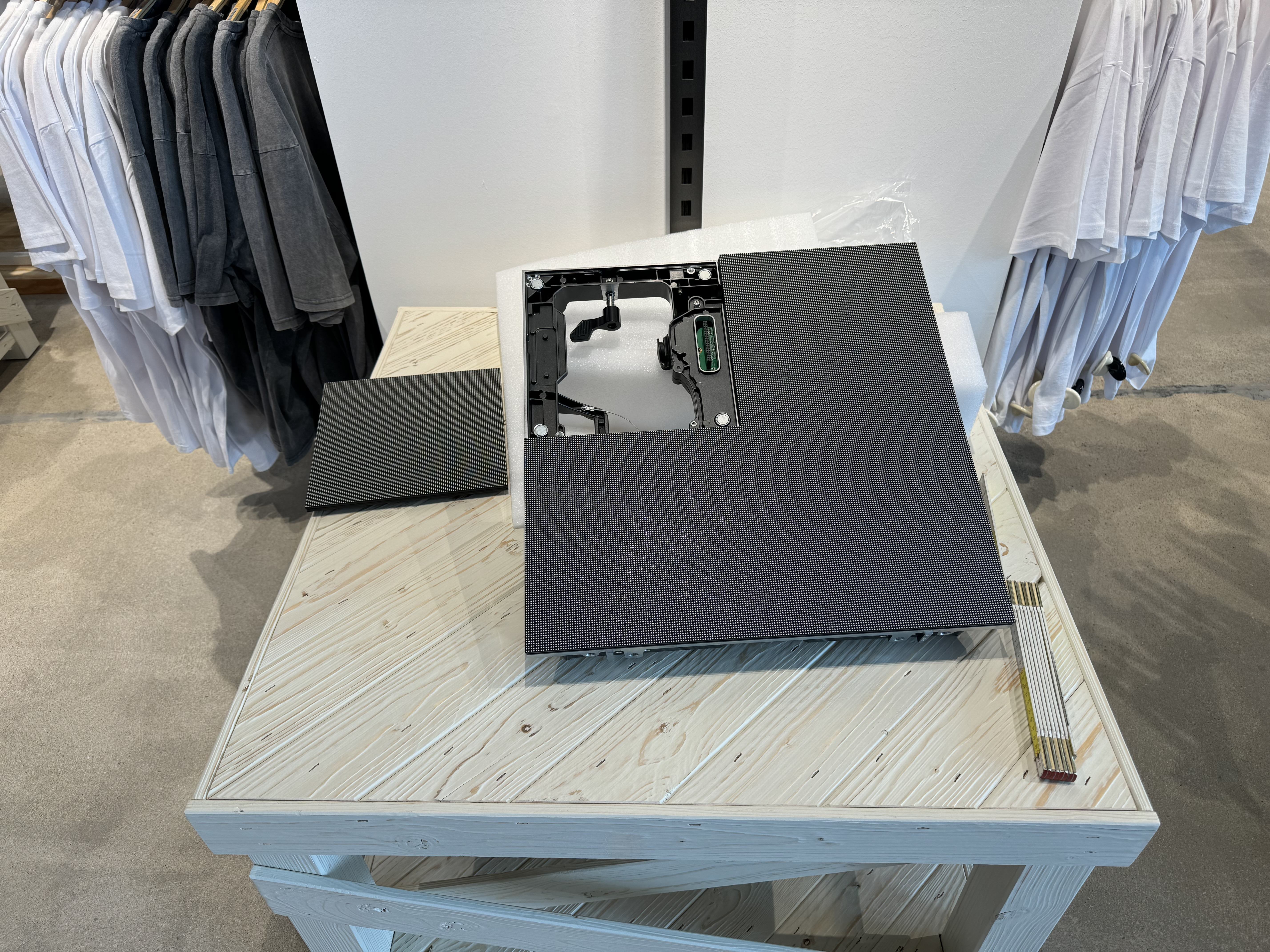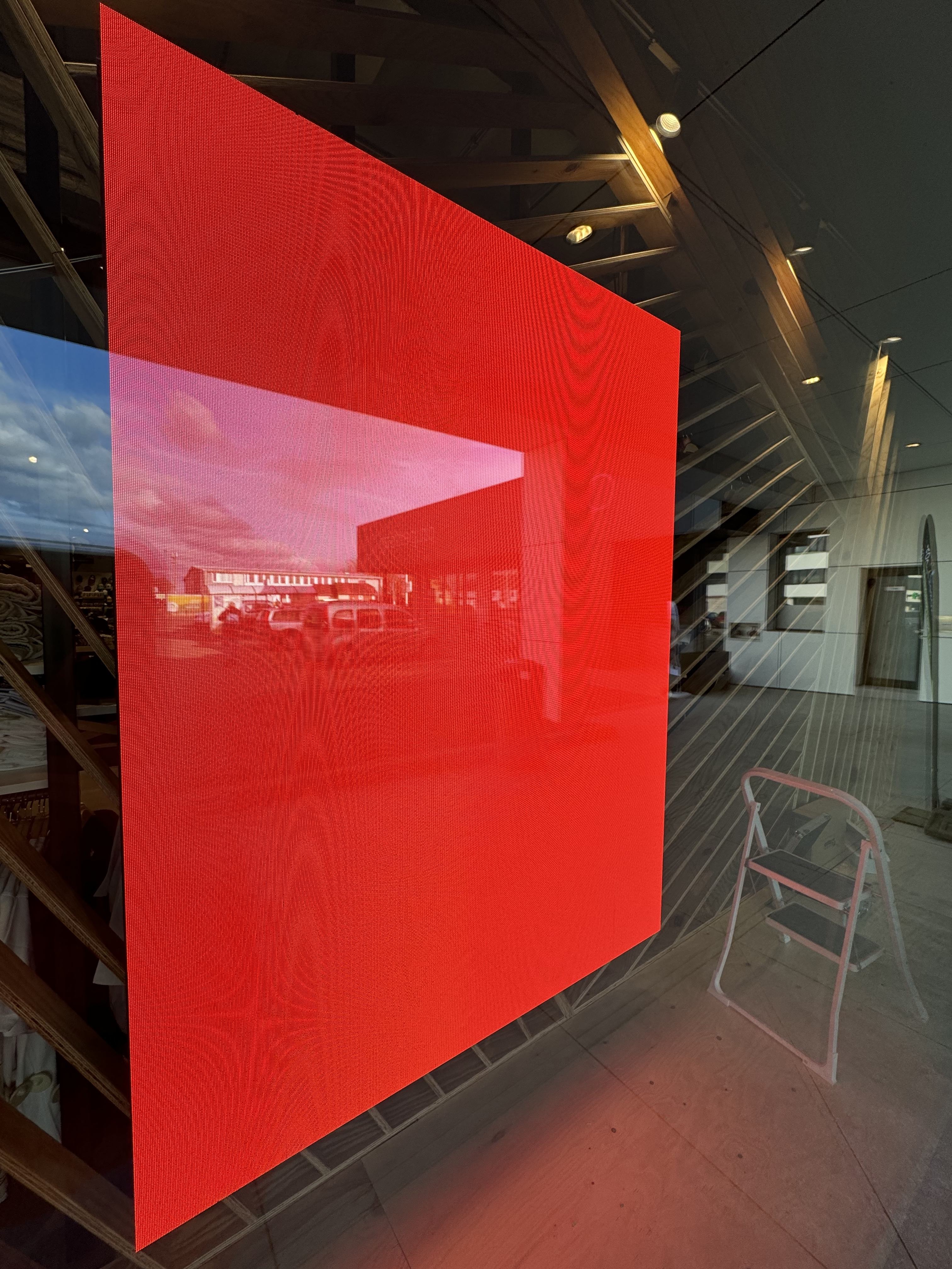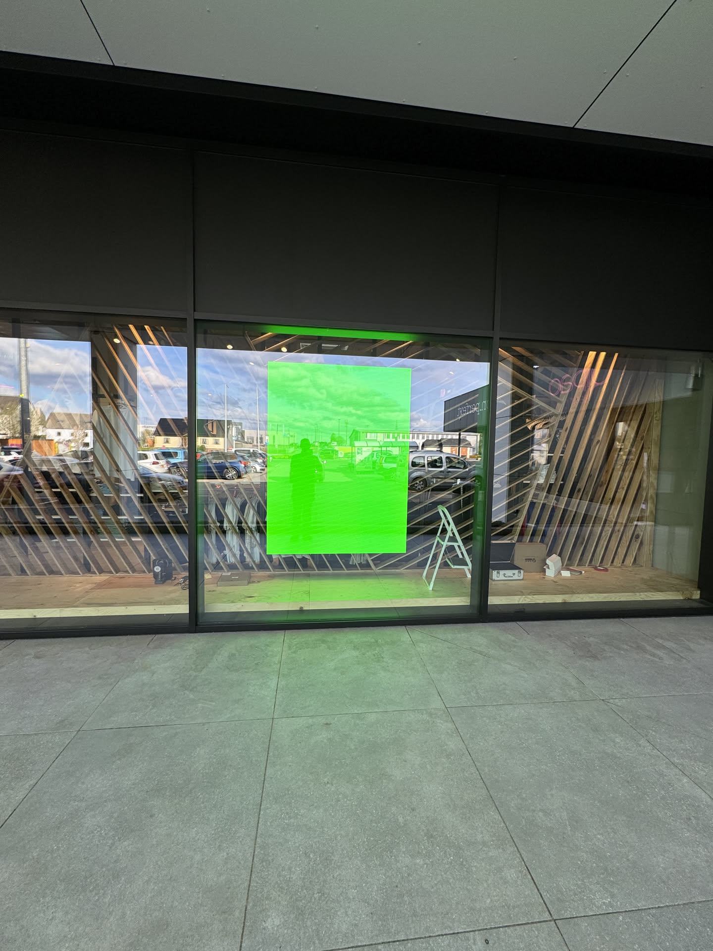Indoor LED Display als Schaufenster-Lösung. Das P2.5mm Display wurde auf einer Holzplatte montiert und bietet mit 1,5m × 2m (3 m²) eine beeindruckende Werbefläche, die von außen und innen gut sichtbar ist.